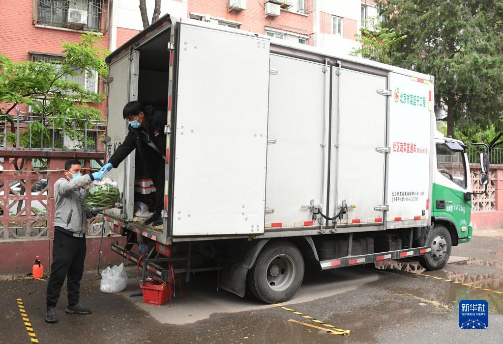 4月27日,在北京市海淀区北下关街道蔬菜直通车皂君西里社区站点,工作人员从货车上卸下蔬菜。