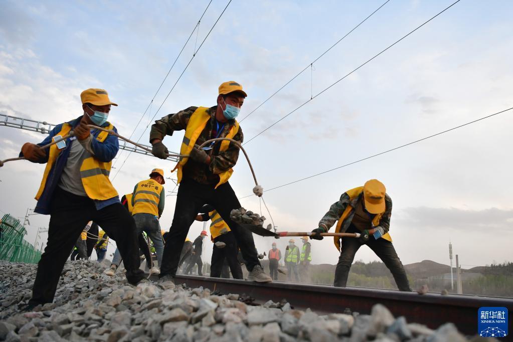 中铁十一局建设者在中兰客专(甘肃段)接入中川城际铁路道岔插铺施工现场作业(4月26日摄)。