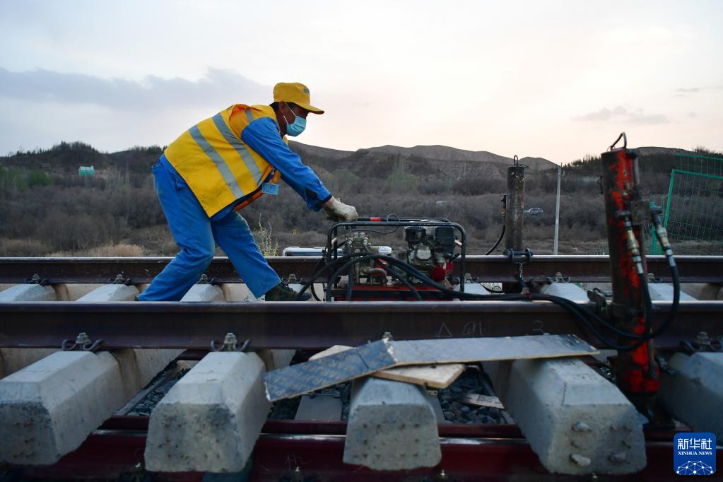 中铁十一局建设者在中兰客专(甘肃段)接入中川城际铁路道岔插铺施工现场作业(4月26日摄)。