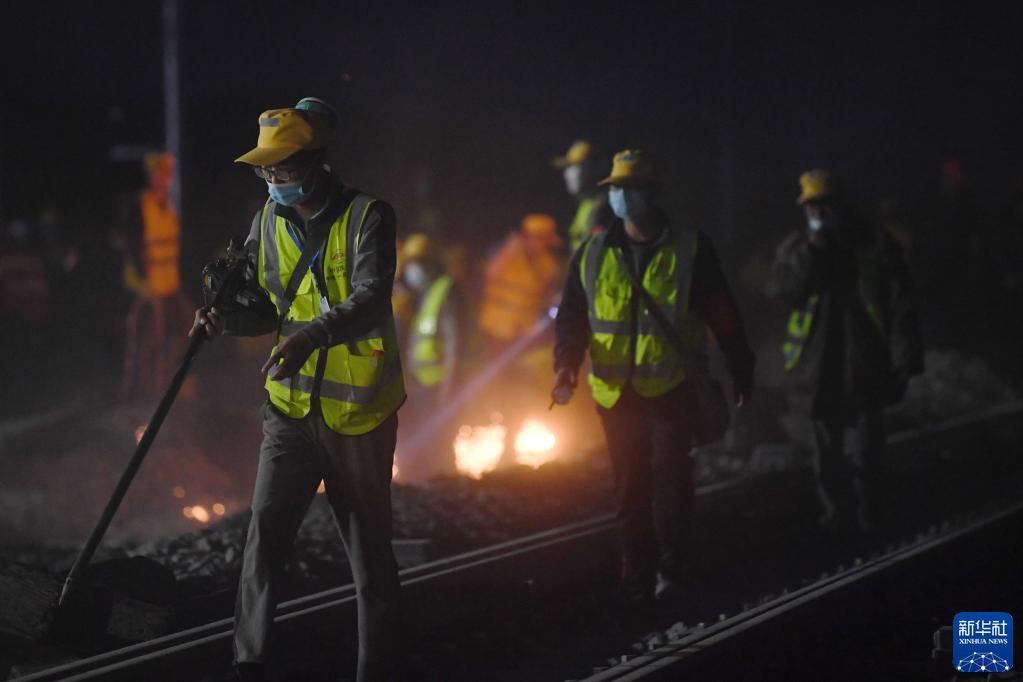 中铁十一局建设者在中兰客专(甘肃段)接入中川城际铁路道岔插铺施工现场作业(4月26日摄)。