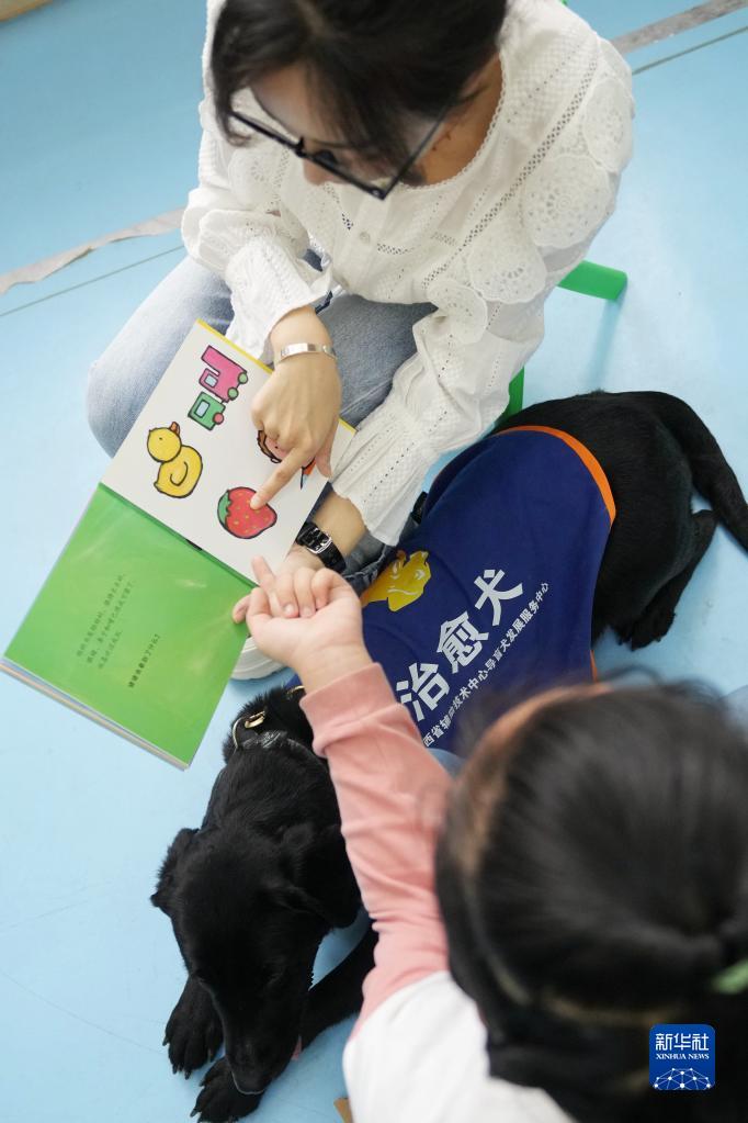 4月24日,在西安市启智学校,治愈犬“黑妹”参与孤独症儿童的绘本阅读课程。新华社记者 李一博 摄