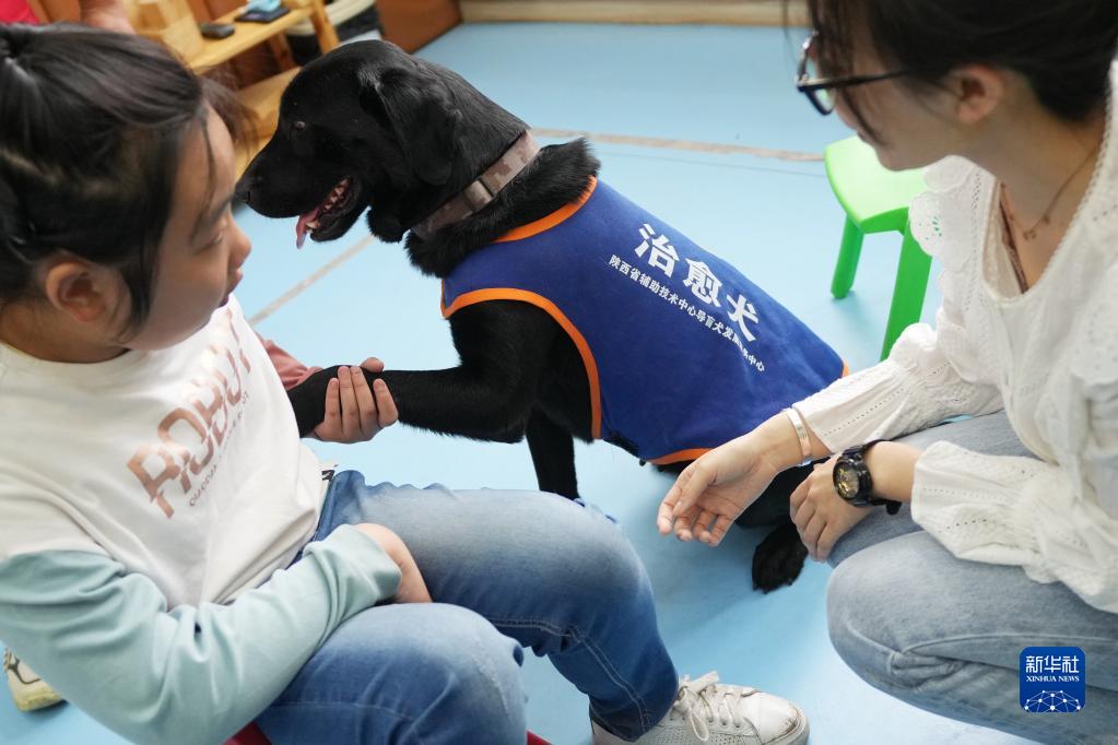 4月24日,在西安市启智学校,陕西师范大学治愈犬参与孤独症儿童康复教育项目成员胡艾新(右)带领孤独症儿童与治愈犬“黑妹”互动。
