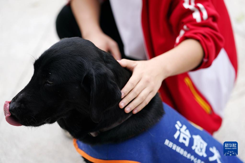 4月24日,在西安市启智学校,一名学生抚摸着治愈犬“黑妹”。