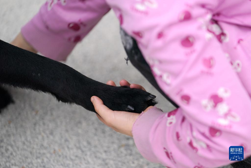 4月24日,在西安市启智学校,一名学生与治愈犬“黑妹”互动。