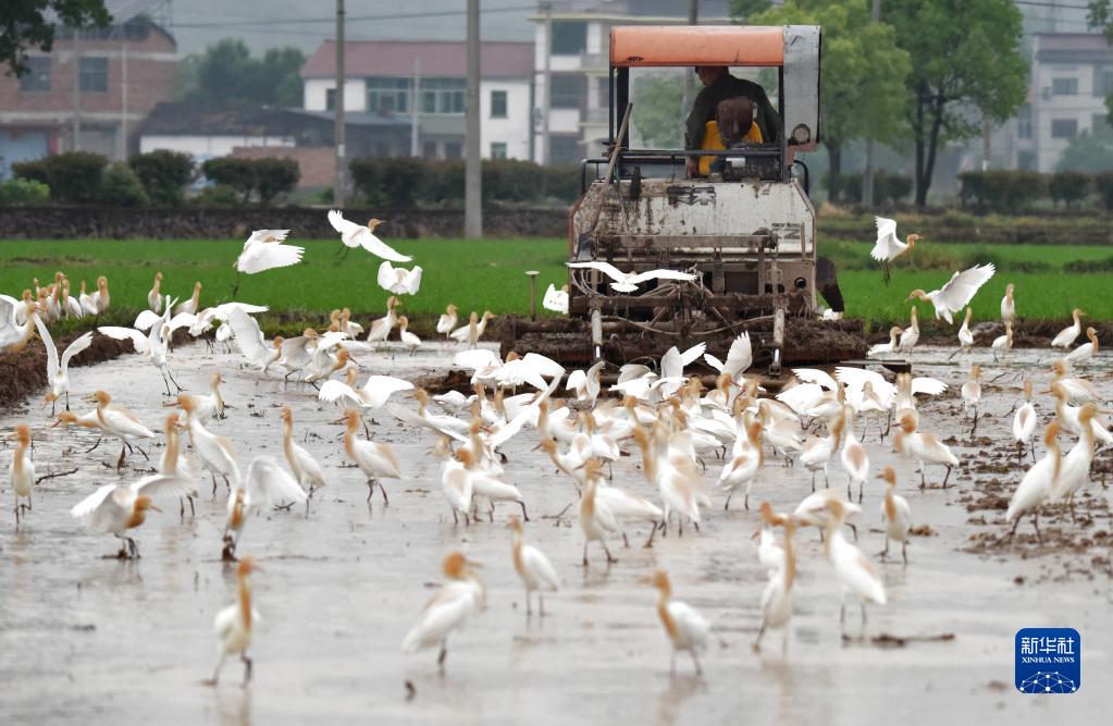 4月27日,成群的鹭鸟跟在翻耕水田的拖拉机后觅食、飞舞。