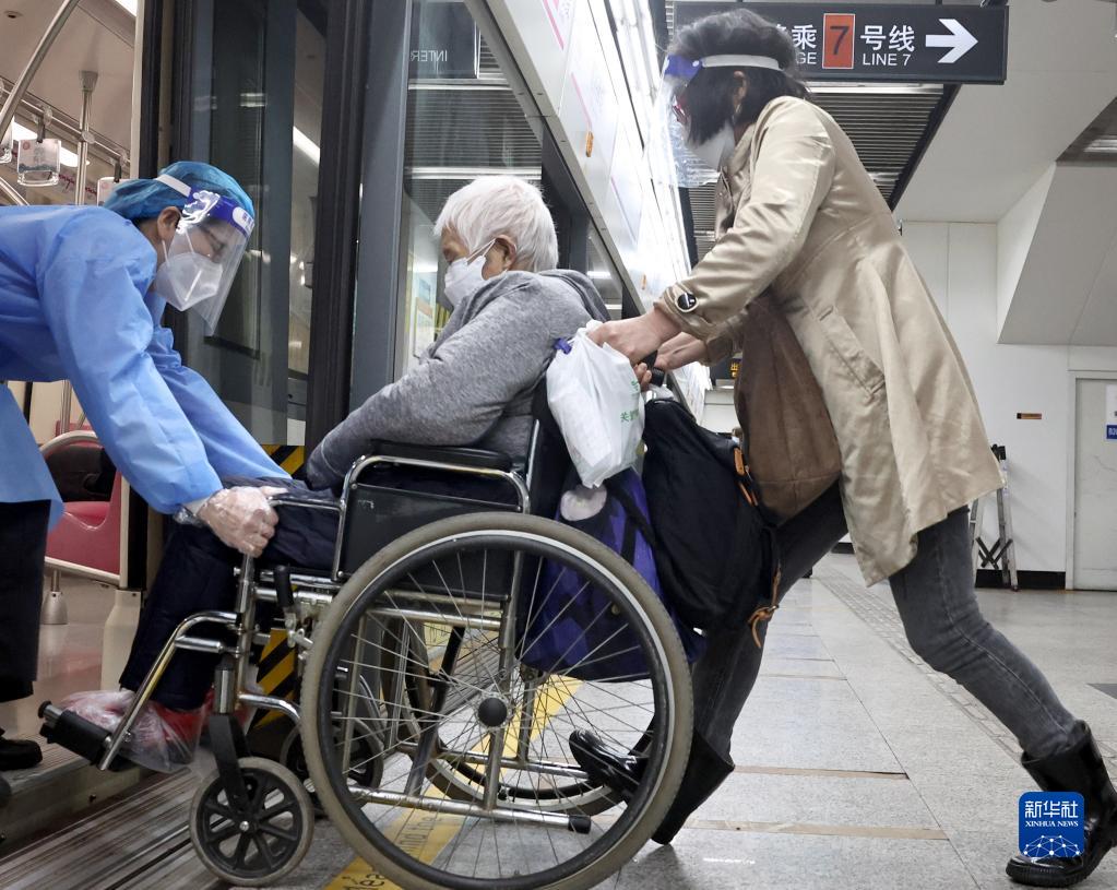 4月26日,上海地铁6号线高科西路站站长茆瑞星(左)帮助从医院看病返回的市民上车。