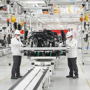 2022年4月22日,在一汽集团红旗繁荣工厂,工人在进行生产作业。