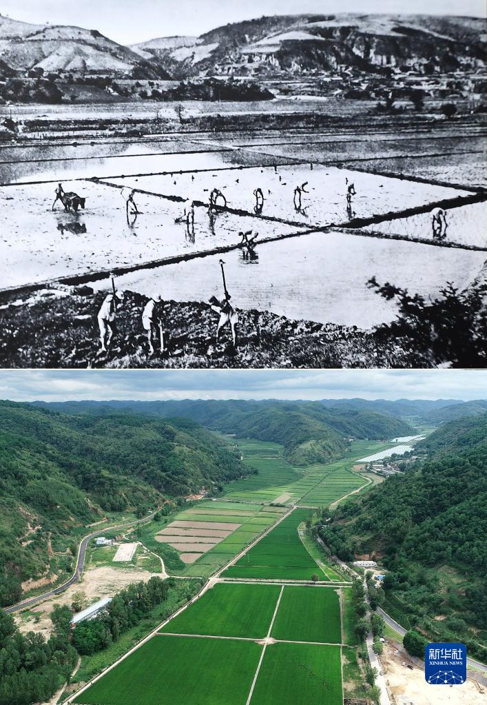 拼版照片:上图为抗战时期延安南泥湾的生产场景(资料照片);下图为2021年7月21日拍摄的南泥湾稻田(无人机照片,新华社记者张博文摄)。