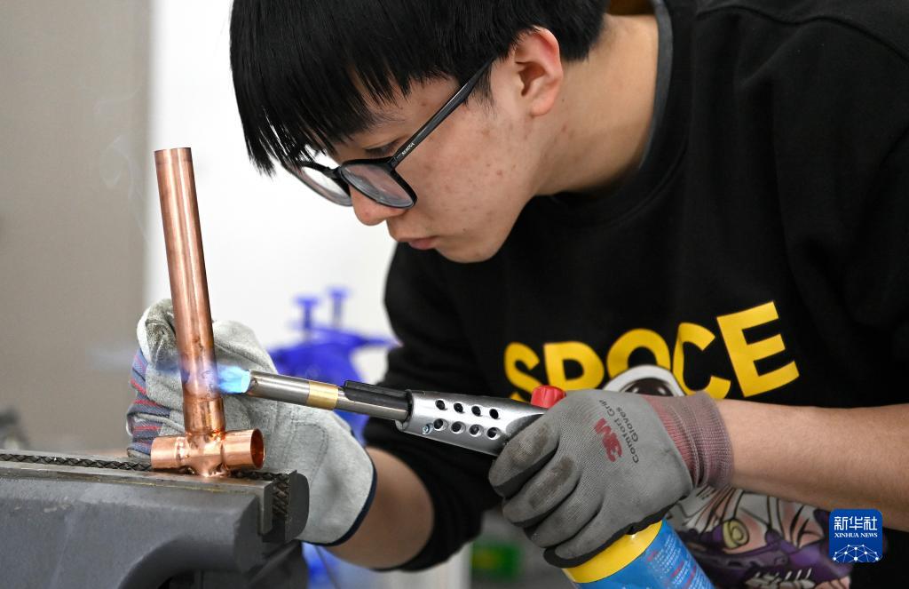 陕西建设技师学院的学生在备战世界技能大赛管道与制暖项目(3月23日摄)。