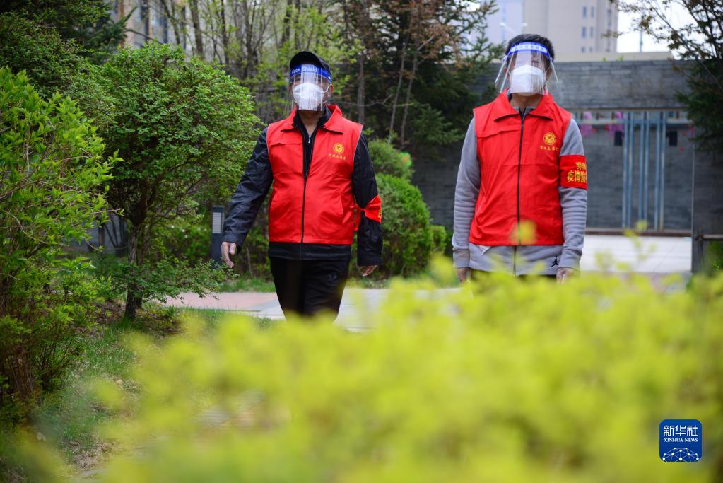 4月28日,志愿者在小区内开展志愿巡逻工作。