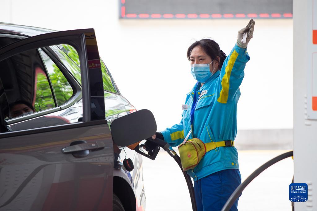 4月28日,江苏省南京市一加油站的工作人员给车辆加油。