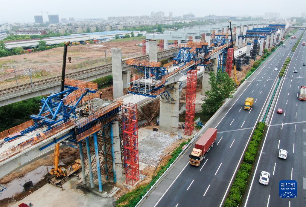 这是4月28日拍摄的江苏南沿江城际铁路南京段跨西气东输连续梁施工现场(无人机照片)。