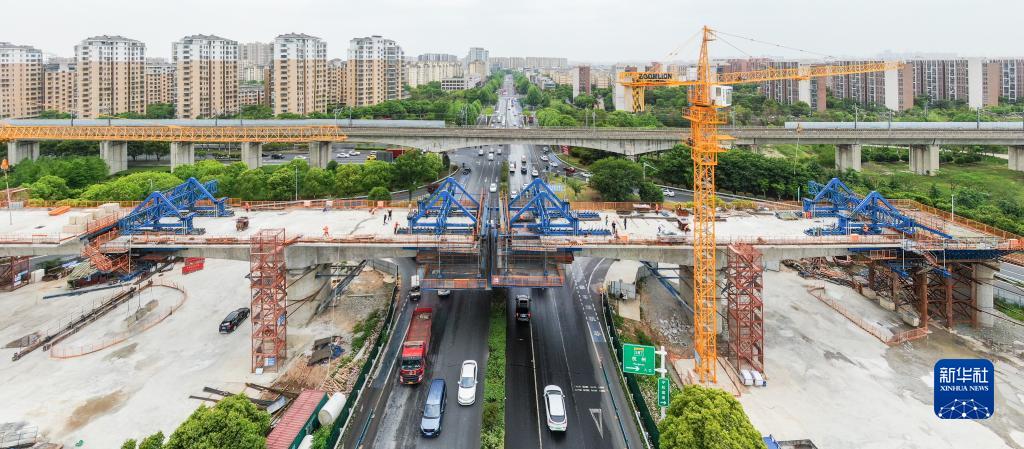 这是4月28日拍摄的江苏南沿江城际铁路南京段站前1标跨上坊互通连续梁施工现场(无人机照片)。