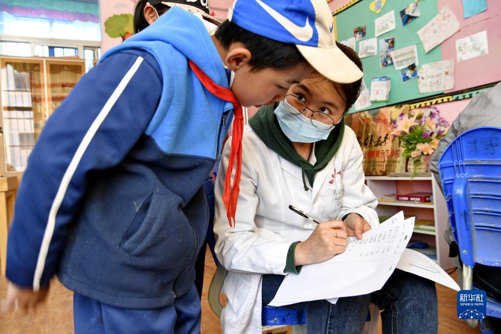 4月22日,医疗专家为曲水县小学的学生进行先心病筛查登记。
