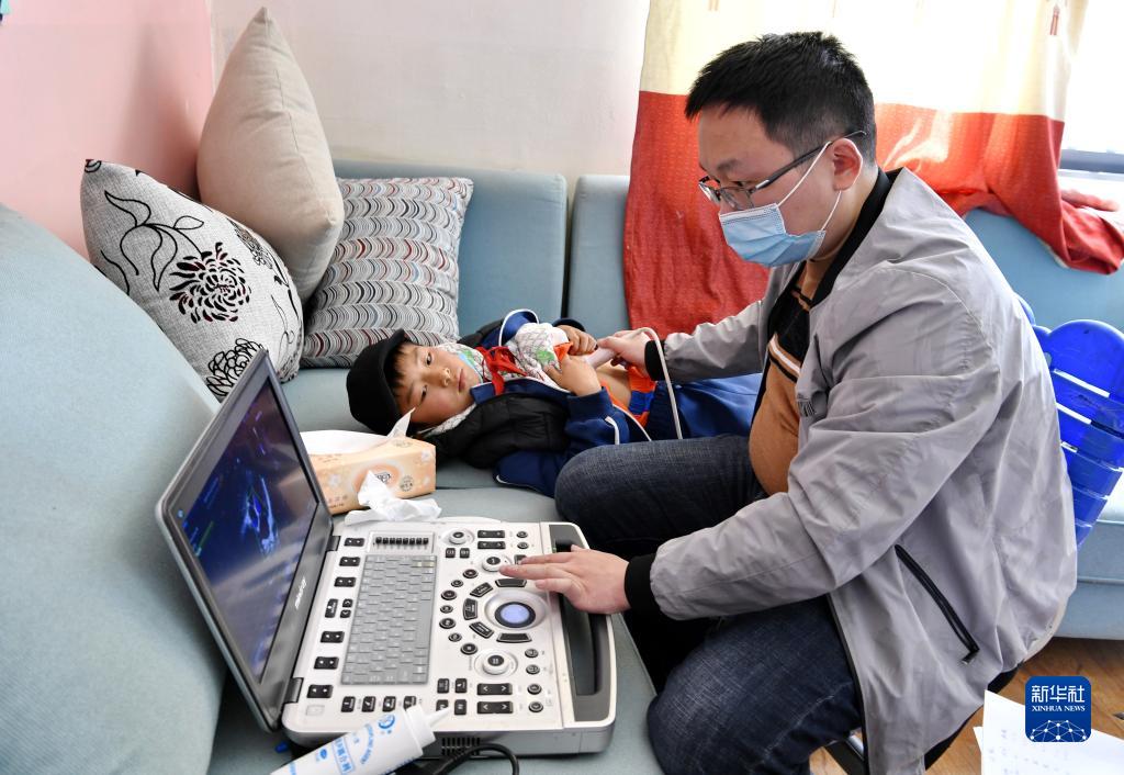 在曲水县小学,南京医科大学第二附属医院医生尹修文为先心病患儿做检查(4月22日摄)。