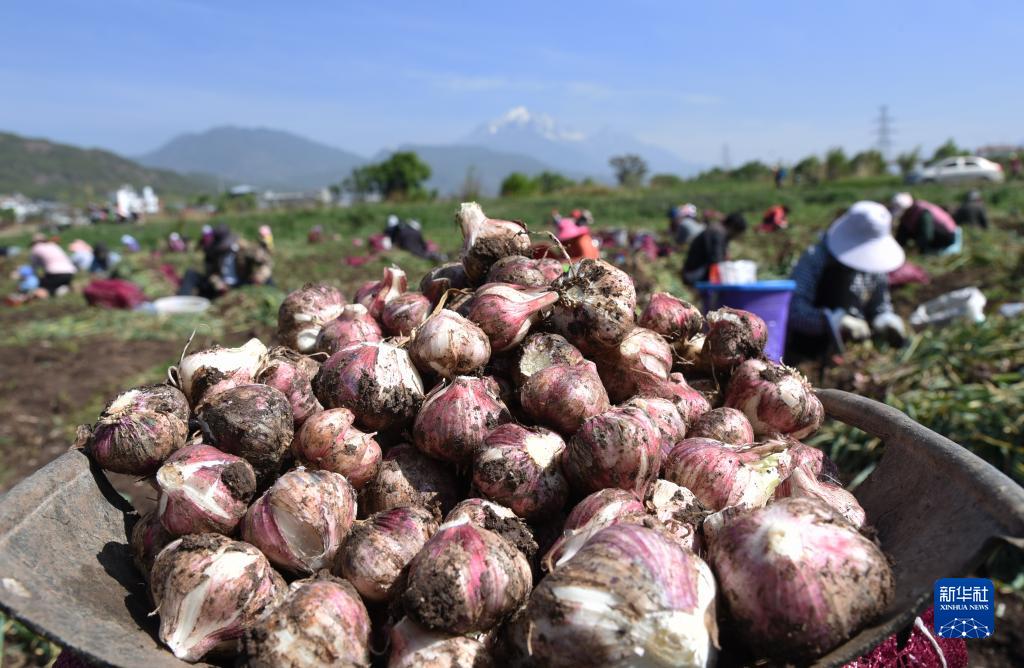 4月28日,农民在云南省丽江市玉龙县黄山镇长水社区蒜田里收获大蒜。
