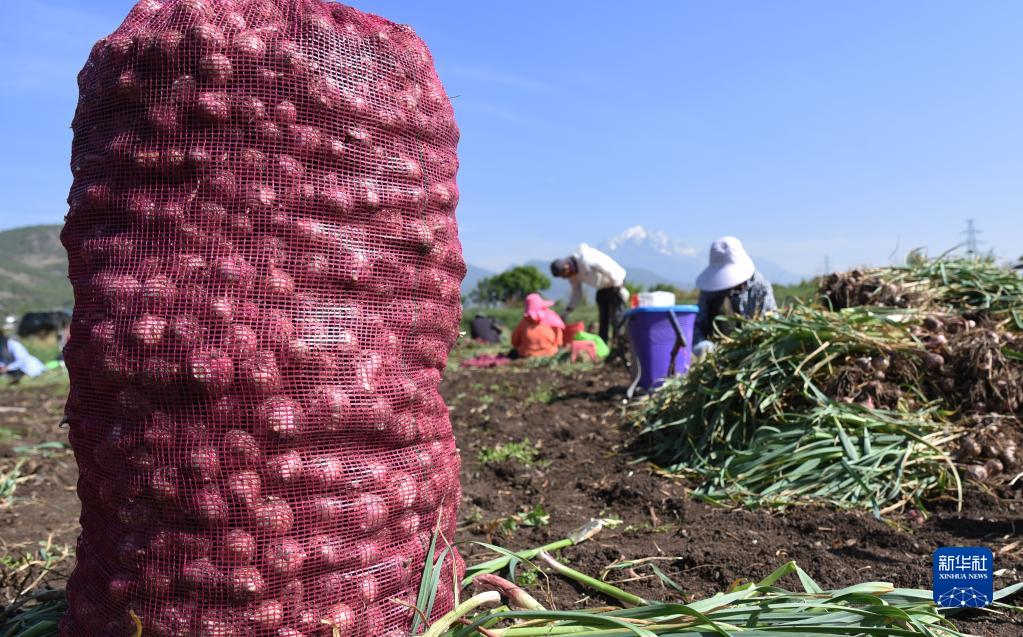 时下,在云南省丽江市玉龙县黄山镇蒜田里,农民趁着持续的晴好天气,抓紧时间采收大蒜。