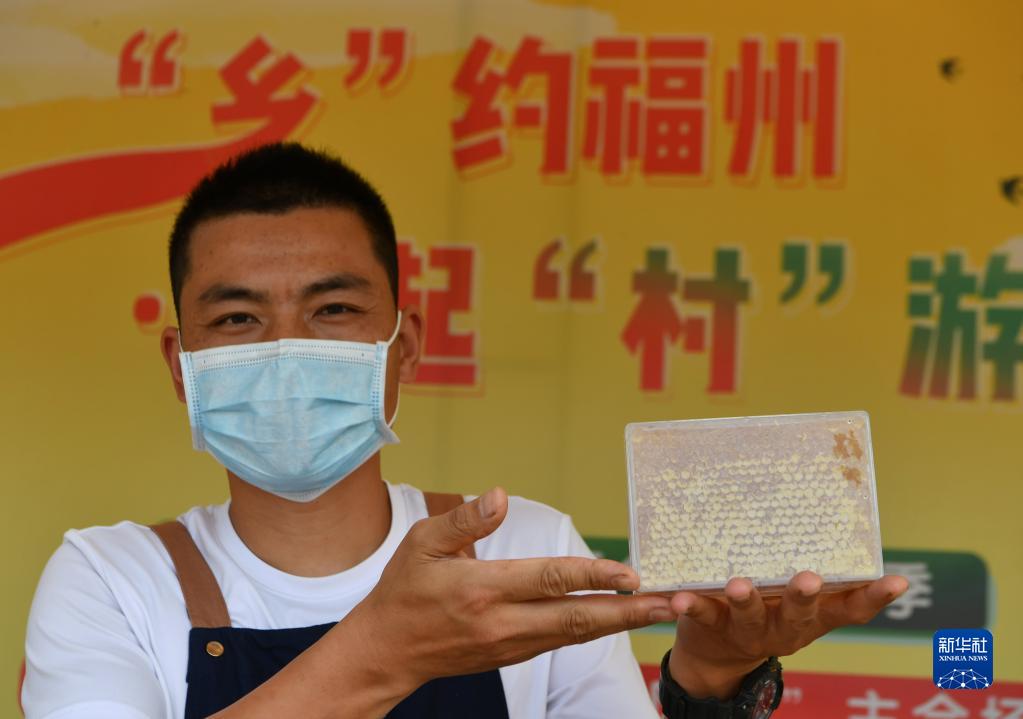 4月28日,在2022福州美丽乡村旅游季启动仪式现场,永泰县返乡创业致富带头人杨经提展示他的特色农产品巢蜜。