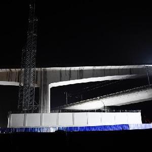 4月28日晚,由中铁上海工程局承建的杭温铁路二期工程跨杭黄铁路特大桥连续梁转体53.4度,安全跨越既有线,实现精准对接,这是杭温铁路全线首座跨高铁连续梁。