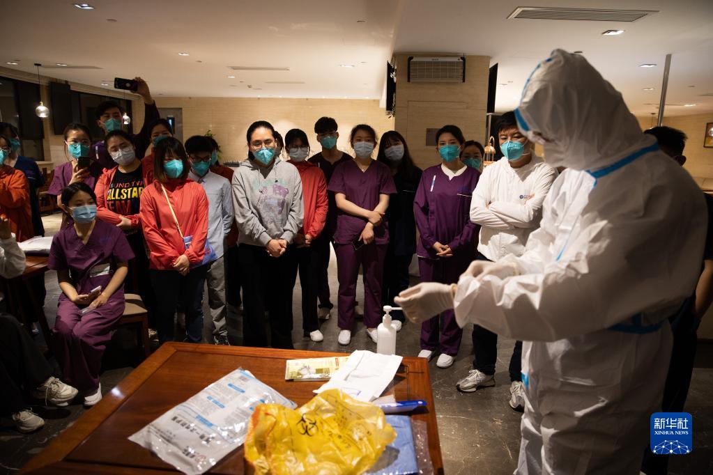 4月28日,在上海浦东北蔡镇一家酒店,东方医院南院医护人员和下午抵达的杭州口腔医院援沪医疗队队员交流核酸采样注意事项。
