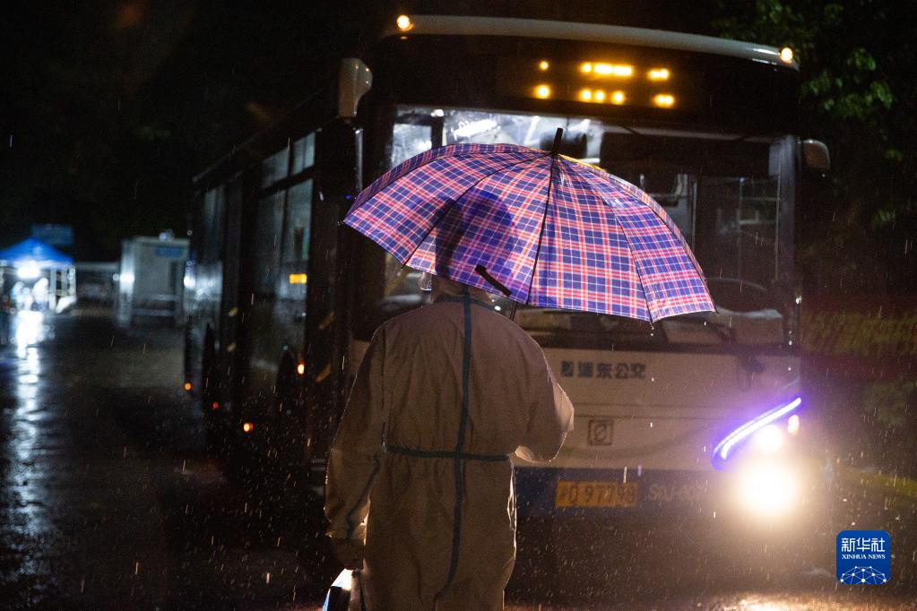 4月28日,在上海浦东北蔡镇联勤村村口,志愿者站在雨中等待转运的密接者上车。
