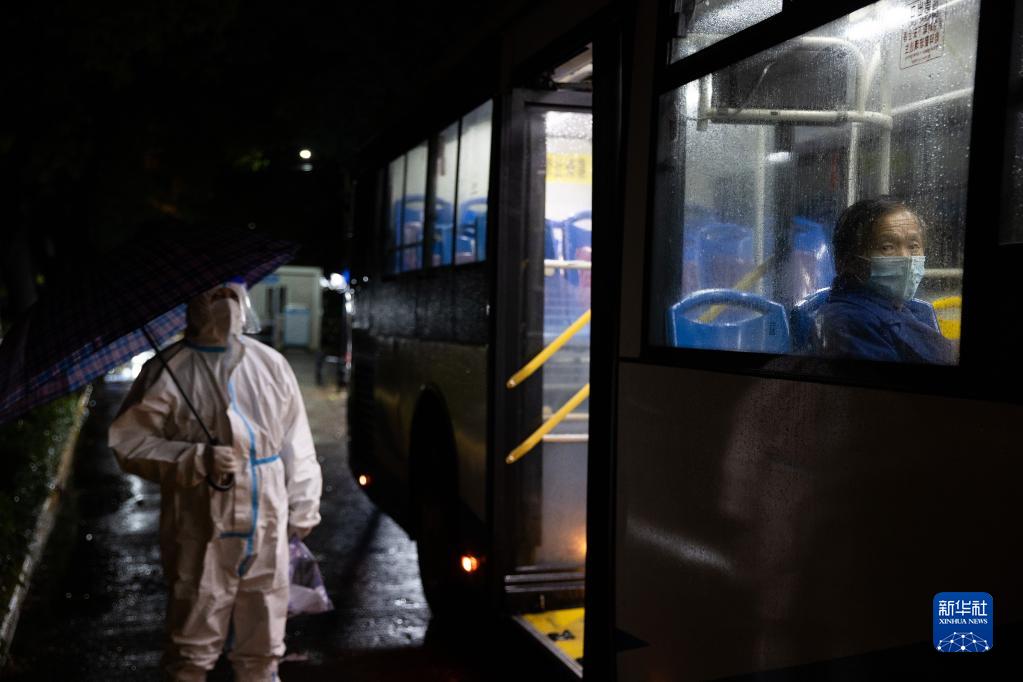4月28日,在上海浦东北蔡镇联勤村村口,志愿者站在雨中等待转运的密接者上车。