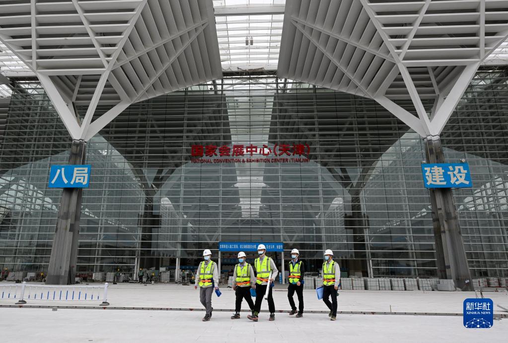 4月27日,刘飞(中)与技术管理人员从国家会展中心(天津)二期中央大厅前广场走过。