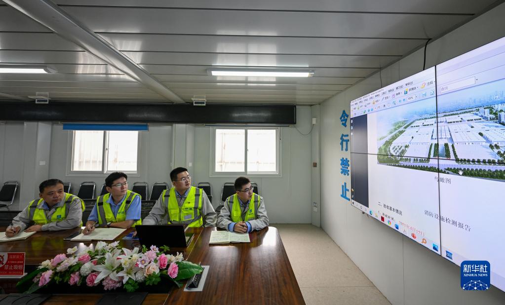 4月27日,刘飞(右二)与技术管理人员在中建八局国家会展中心(天津)二期项目部会议室开会。