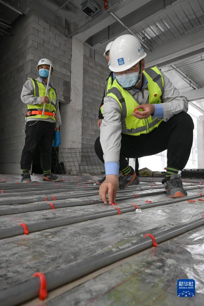4月27日,在国家会展中心(天津)二期一展馆施工现场,刘飞(前)勘察现场地热管线铺设情况。