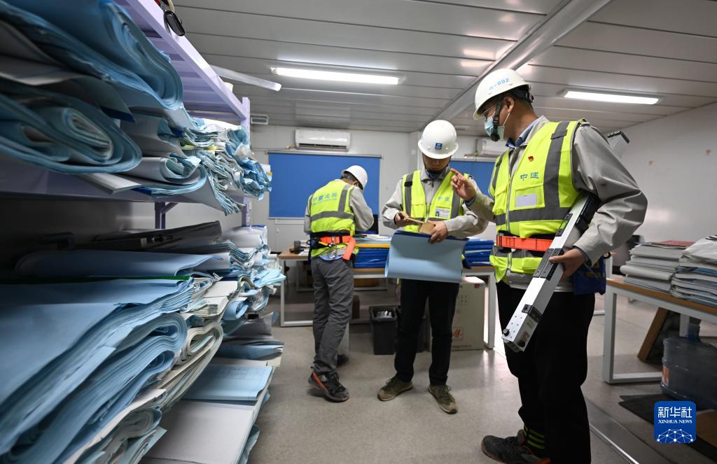 4月27日,在国家会展中心(天津)二期项目部办公室内,刘飞(右)在进场勘察前与同事交流工作细节。
