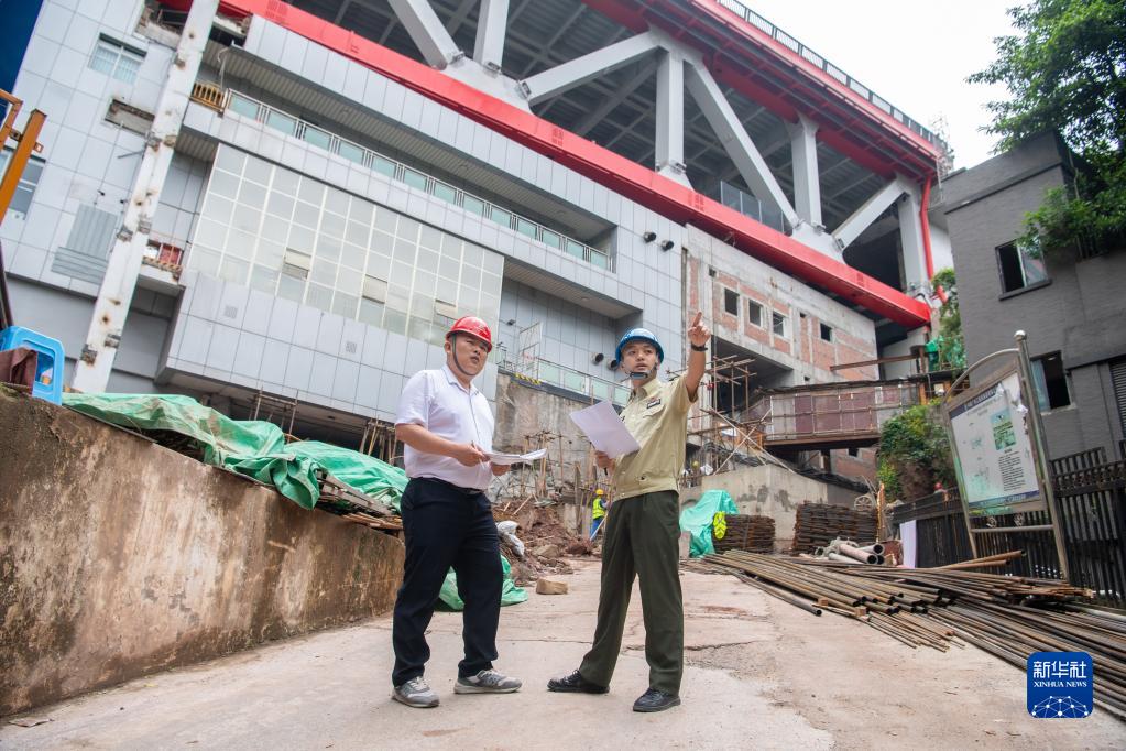 4月28日,巡查员王道淮(右)在重庆轨道2号线、10号线曾家岩站施工现场与施工方交流注意事项。