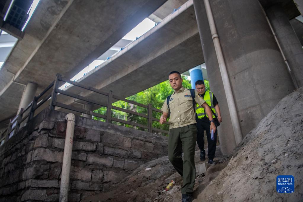 4月28日,巡查员王道淮(前)和贾万跃在重庆轨道交通2号线和3号线的交汇处巡查。