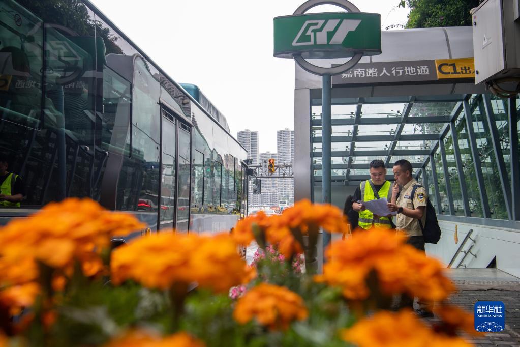 4月28日,巡查员王道淮(右)和贾万跃重庆轨道2号线牛角沱站翻看资料。