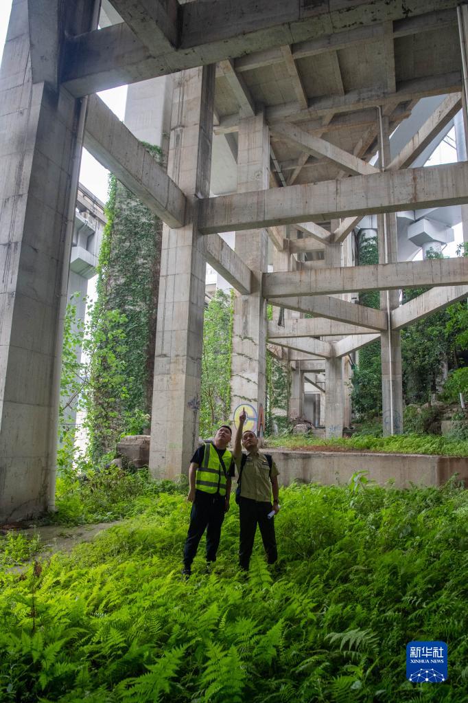 4月28日,巡查员王道淮(右)和贾万跃在重庆轨道2号线沿线巡查,此时轨道列车正从他们头上驶过。