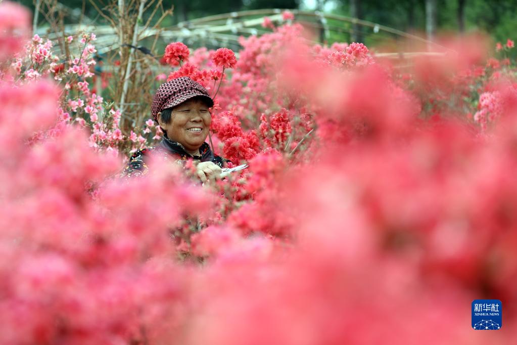 4月29日,在石家庄市藁城区南董镇南洼村一处花卉苗木基地,工作人员在修剪花卉。