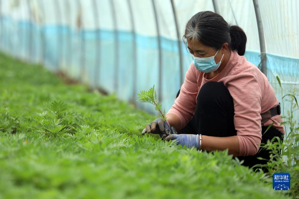 4月29日,在石家庄市藁城区南董镇南洼村一处花卉苗木基地,工作人员在整理花卉。