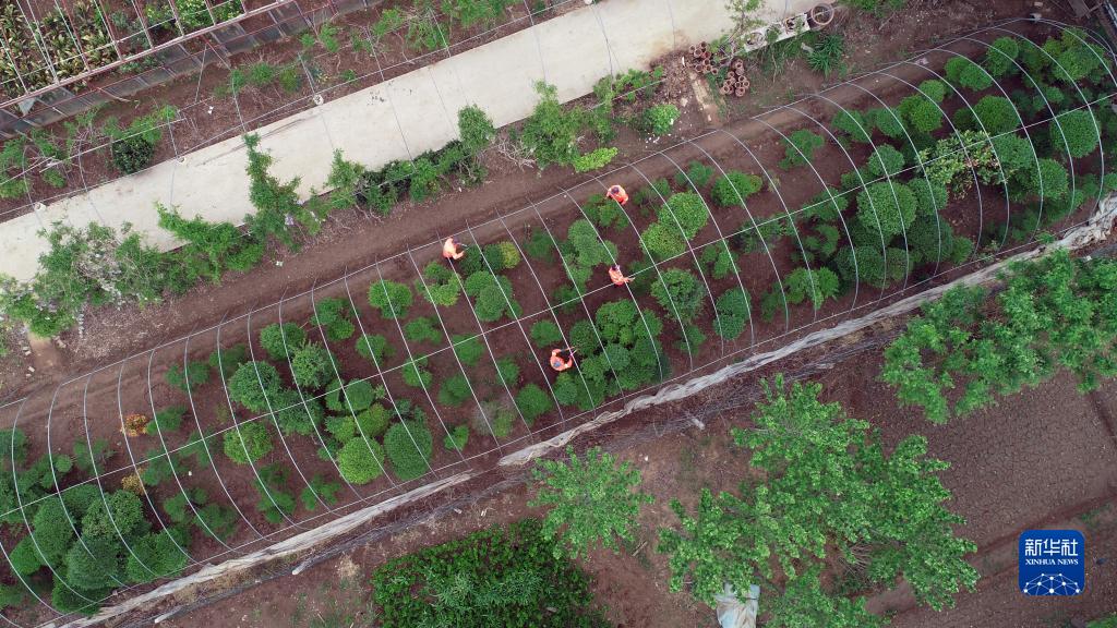 4月29日,在石家庄市藁城区南董镇南洼村一处花卉苗木基地,工作人员在修剪苗木(无人机照片)。