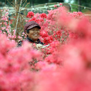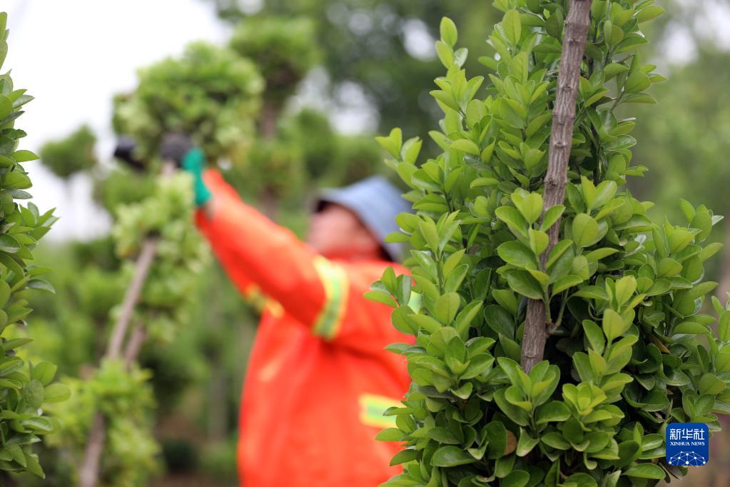 4月29日,在石家庄市藁城区南董镇南洼村一处花卉苗木基地,工作人员在修剪苗木。