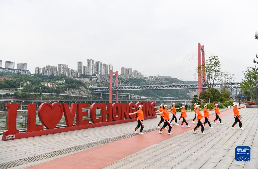 4月29日,市民在重庆市江北区北滨路漫行步道健身。