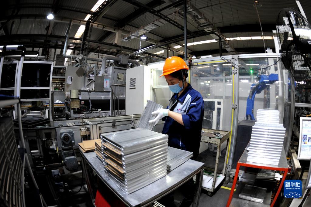 4月29日,上海加冷松芝汽车空调股份有限公司工人在生产车间检查下线产品。