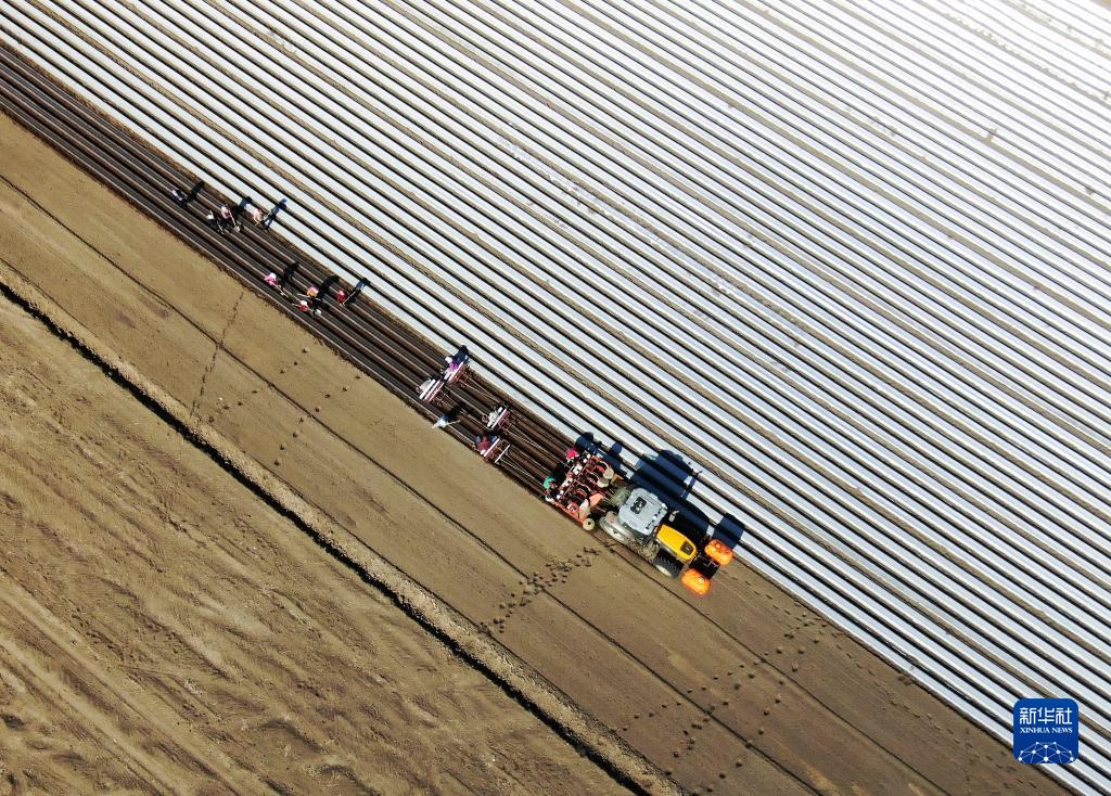 4月29日,工作人员在河北省张家口市塞北管理区农业基地播种胡萝卜(无人机照片)。