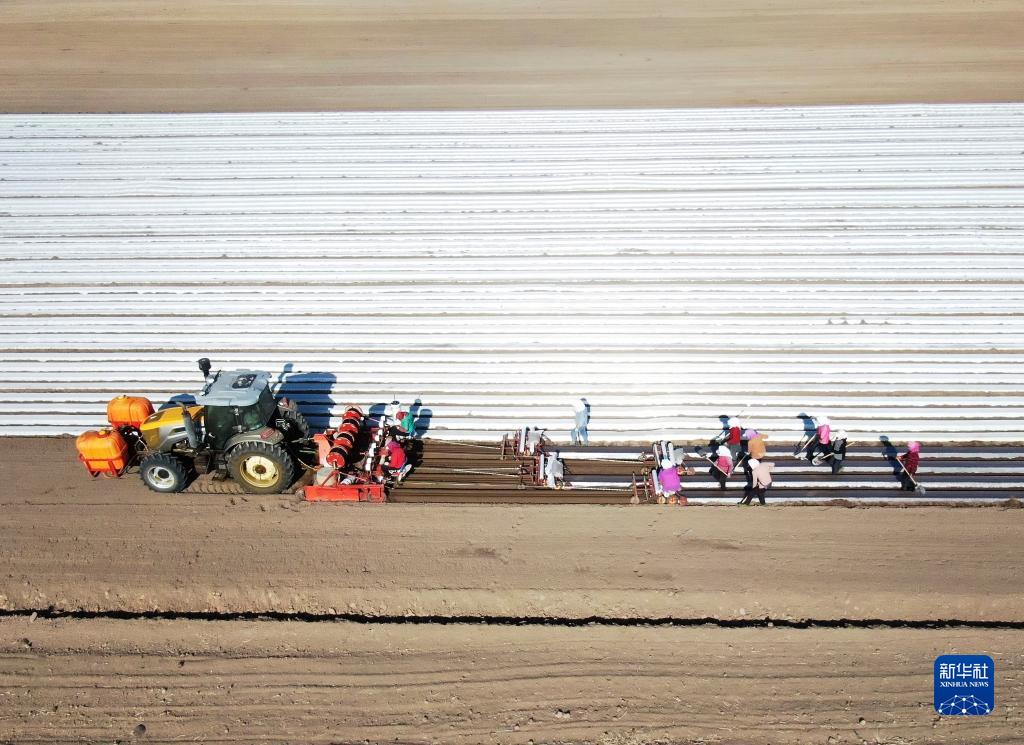 4月29日,工作人员在河北省张家口市塞北管理区农业基地播种胡萝卜(无人机照片)。
