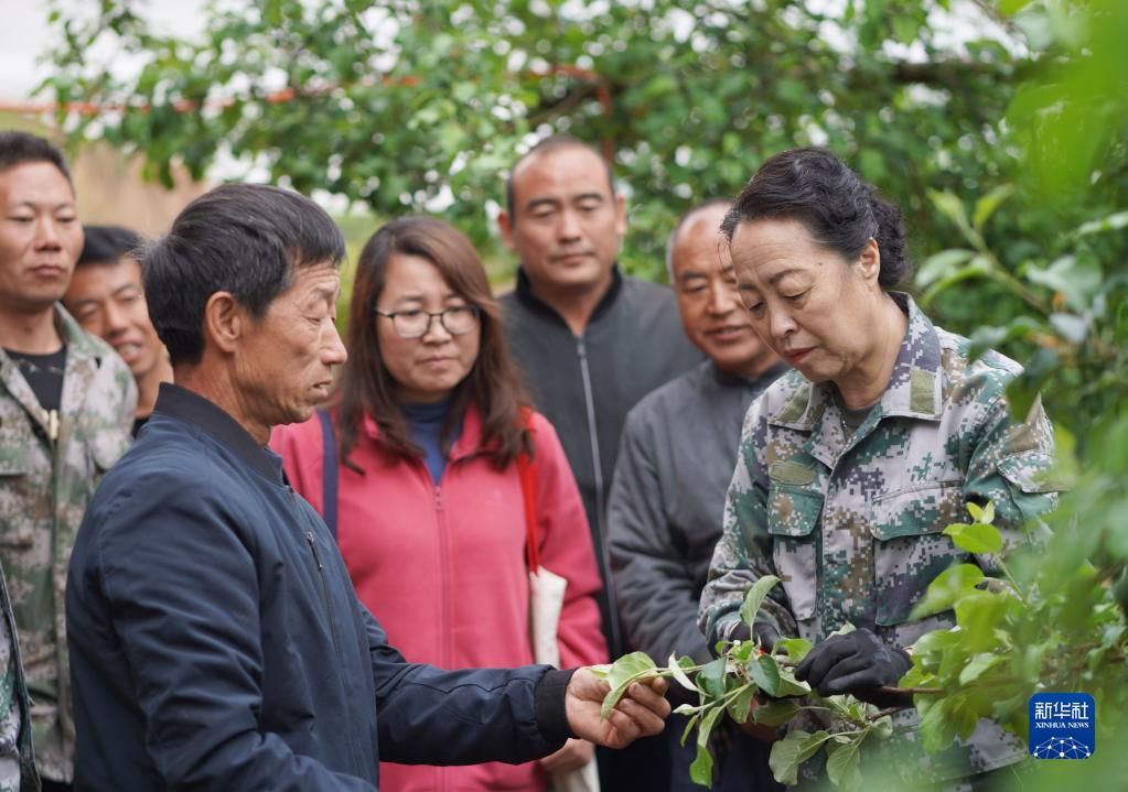 在河北省邢台市内丘县岗底村苹果园,李保国山区开发与林果产业创新团队带头人、李保国教授的爱人郭素萍(前右)和团队成员杨双奎(前左)查看果树生长情况(4月28日摄)。