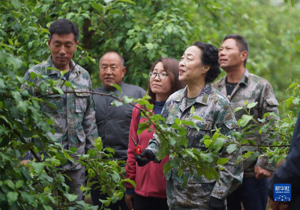 在河北省邢台市内丘县岗底村苹果园,李保国山区开发与林果产业创新团队带头人、李保国教授的爱人郭素萍(右二)给果农讲解果树管护知识(4月28日摄)。