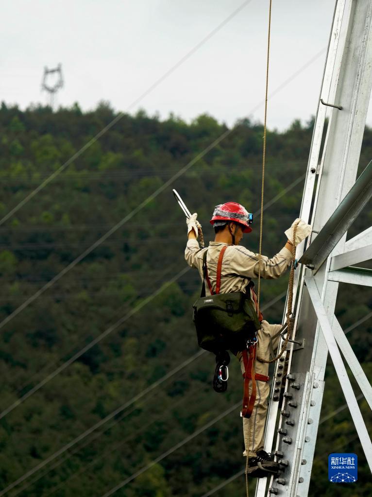 4月27日,国网重庆送变电公司的高空作业人员李海军在攀爬建设中的特高压电力铁塔,准备进入自己百米高空上的作业岗位。