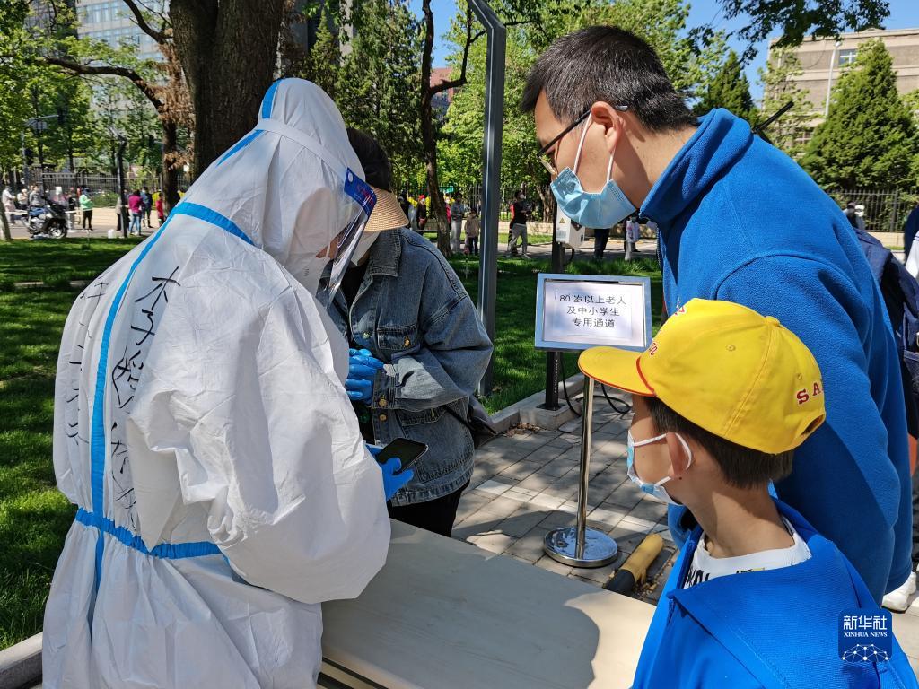 4月30日,在北京市海淀区中关村街道科汇社区的一处临时核酸检测采样点,志愿者(前左)采集参加核酸检测采样人员的身份信息(手机照片)。