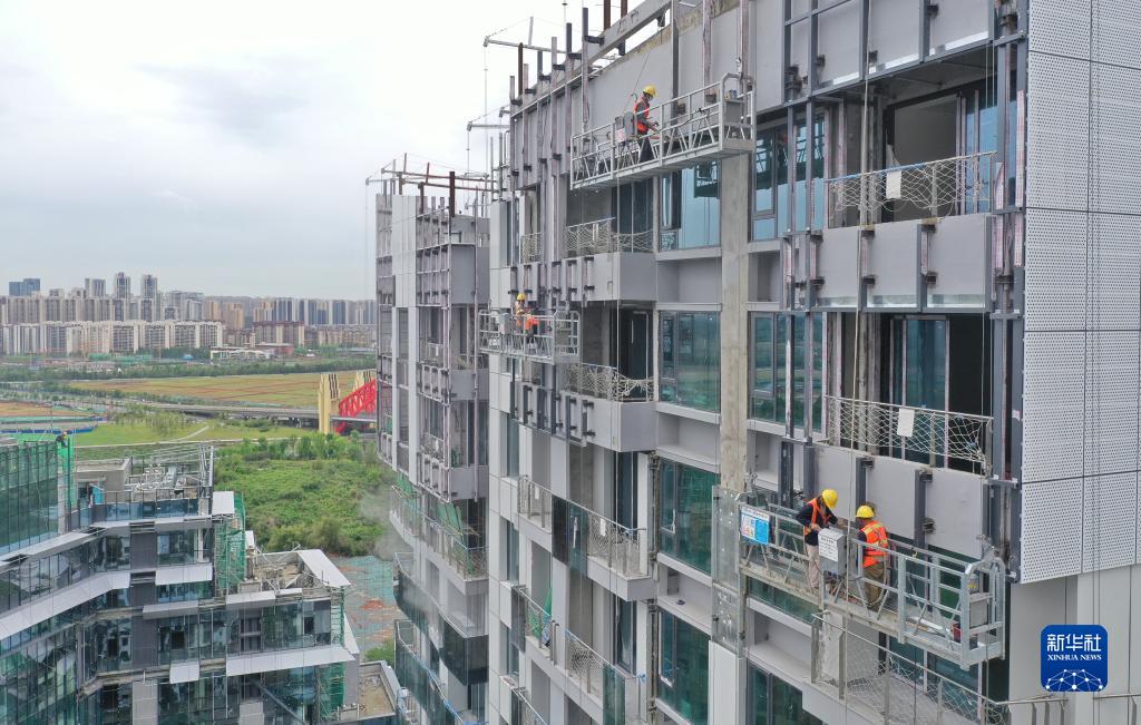 4月30日,工人在成都某工地为一栋超高层建筑安装幕墙。