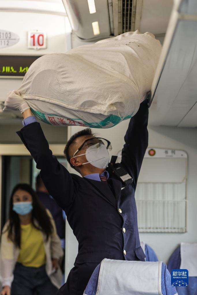 在开往乌鲁木齐方向的“和田玉龙号”列车上,列车员为旅客摆放行李(4月28日摄)。