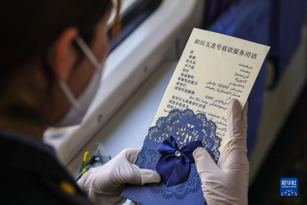 “和田玉龙号”列车员在休息间隙练习维、汉双语服务用语(4月29日摄)。