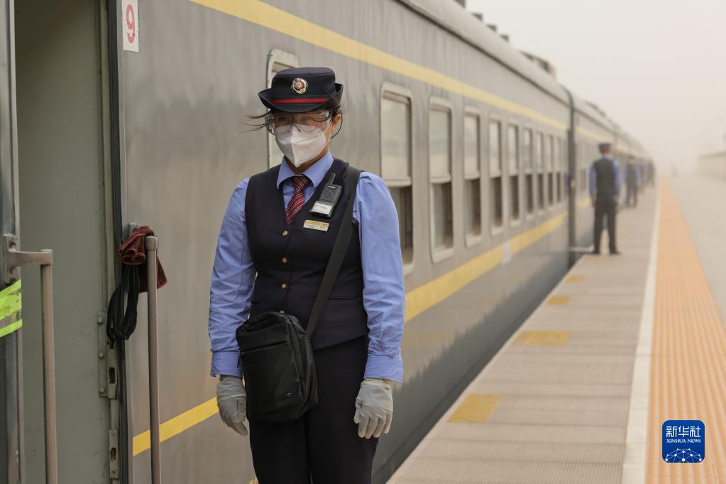 “和田玉龙号”列车的列车员在开往和田方向的列车旁立岗等待旅客(4月27日摄)。